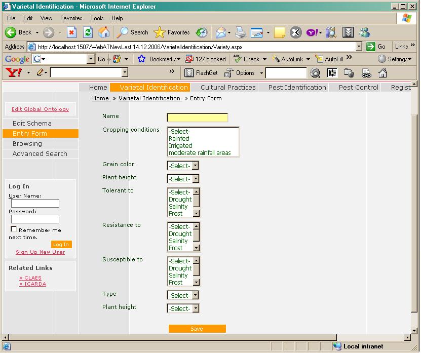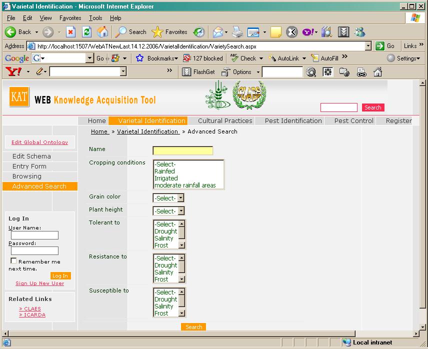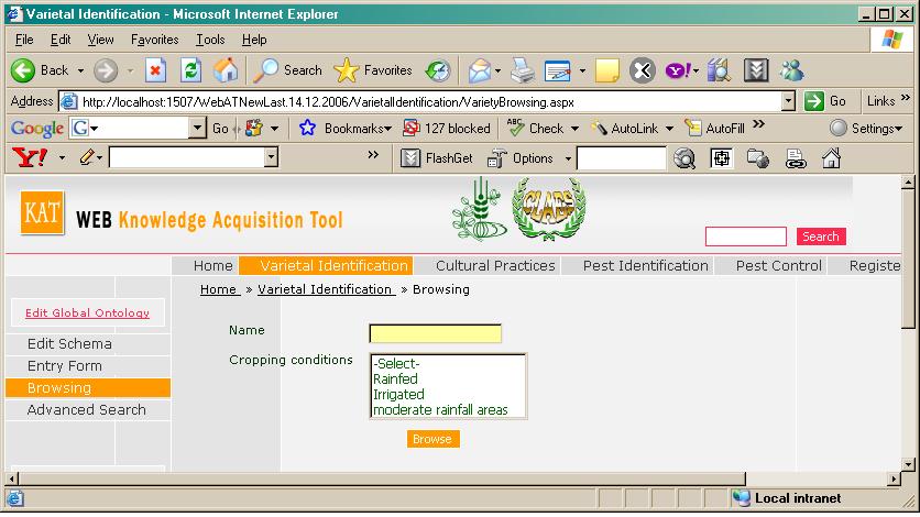 The Edit schema page is used to select specific concepts of the global ontology that will be used for the selected module. For example, concepts that are used in the Variety Identification module differs from those used in the Pest Control module. In addition to selecting concepts from the global ontology, the domain expert specify whether the selected concept will be used for browsing or searching for a specific case in the knowledge base.