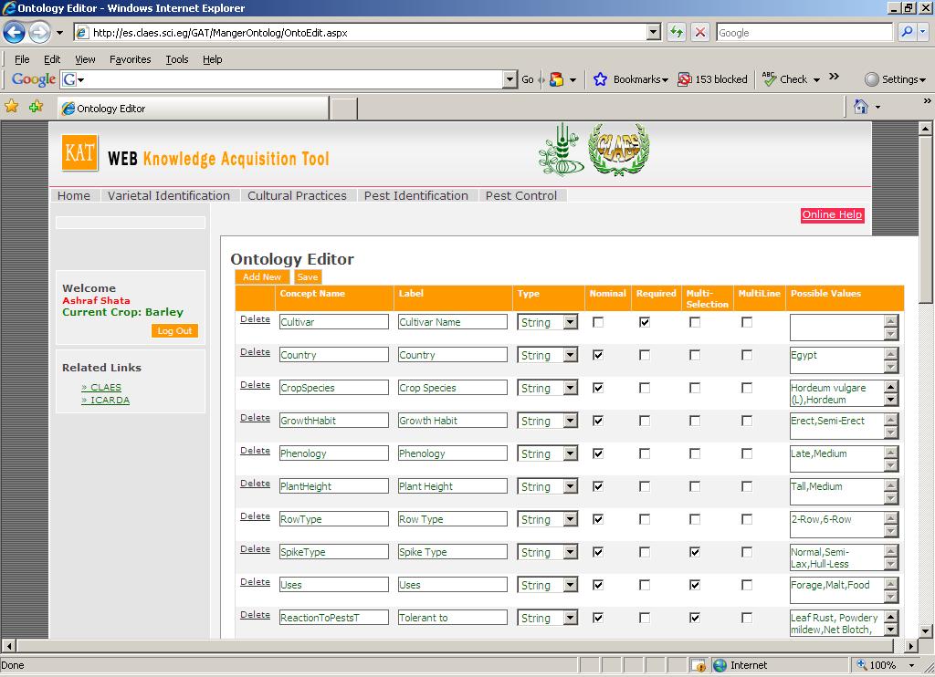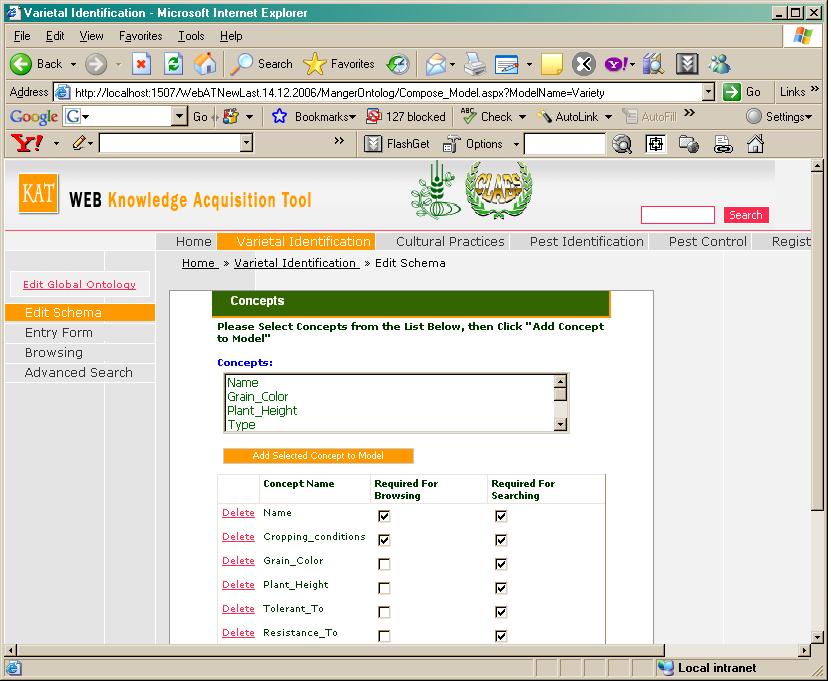 This global ontology will be used in building schemas for the four main modules of WKAT: Variety Identification, Pest Identification, Pest Control, and Cultural Practices. A schema contains the selected "Concepts" that will be used for this module. Not all the concepts of the global ontology will be used in every module. The expert just selects these concepts that relate to one of the four module described above. We will show how to configure schemas below.